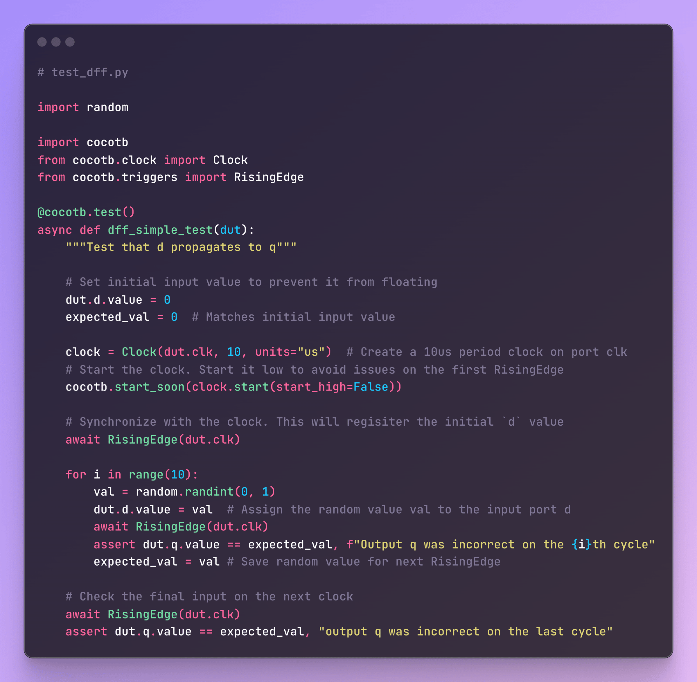 This is done for every clock cycle (notice that the check is added in the python for loop) and as well as for the last clock cycle before the simulation ends. This would be a good point to stop and try the running the updated TB. However, it is always advisable to ensure that the check actually fires if something goes incorrect. I would recommend introducing an error in the RTL in the and run it against the updated Cocotb testbench to see the testcase failing.
