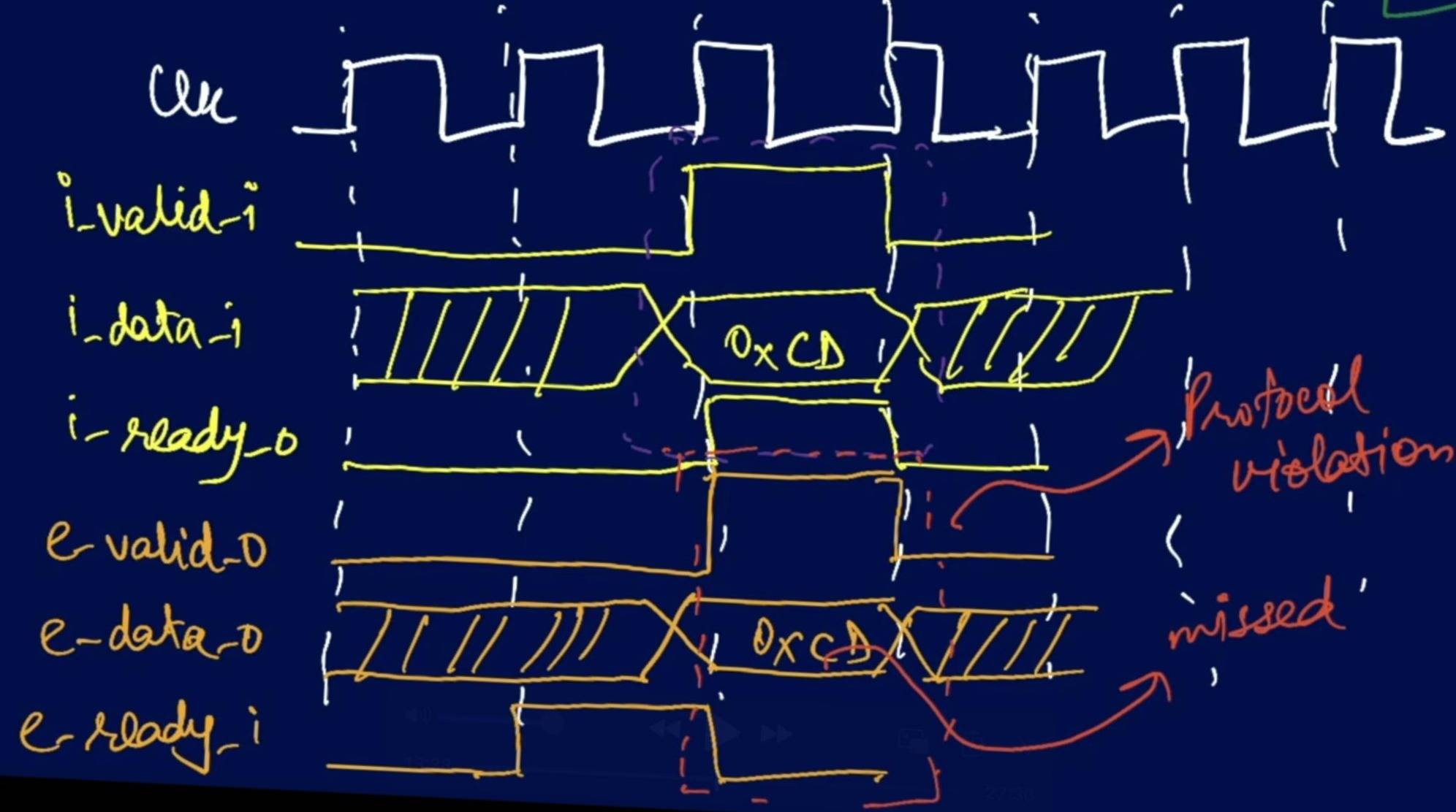In the above waveform, the signals in yellow are the requester side of signals (usually called the ingress side) and the signals in orange are the completer side of signals (called the egress side). With the ready getting asserted a cycle before (signal: e_ready_i) the ready on the ingress side is seen a cycle later (signal: i_ready_o). This leads to an incorrect transfer on the requester side which ultimately leads to a missed (or a dropped) transaction on the completer's end and also a protocolviolation where the valid on the completer side gets de-asserted without a ready.